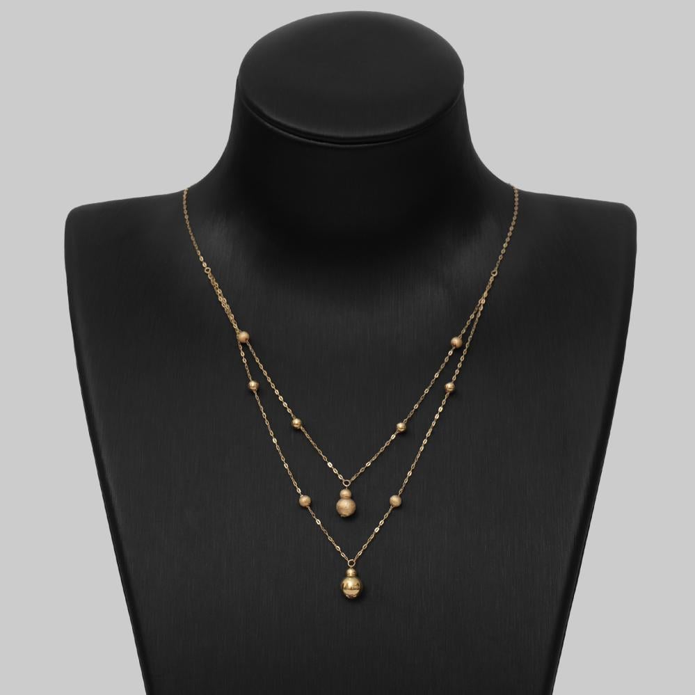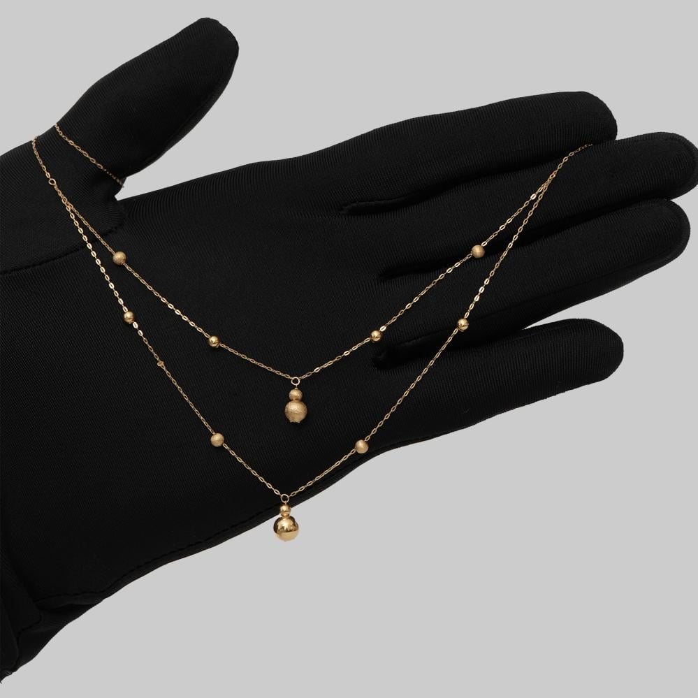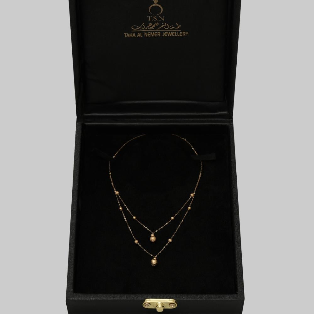 أضيئي حضورك بنعومة ورقي مع شوكر لمعة الأنوثة المصنوع من ذهب عيار 21. تصميمه الطبقي المزيّن بكرات ذهبية صغيرة يمنحك لمسة فريدة تجمع بين البساطة والجاذبية، ليكون خيارك الأمثل في كل مناسبة.