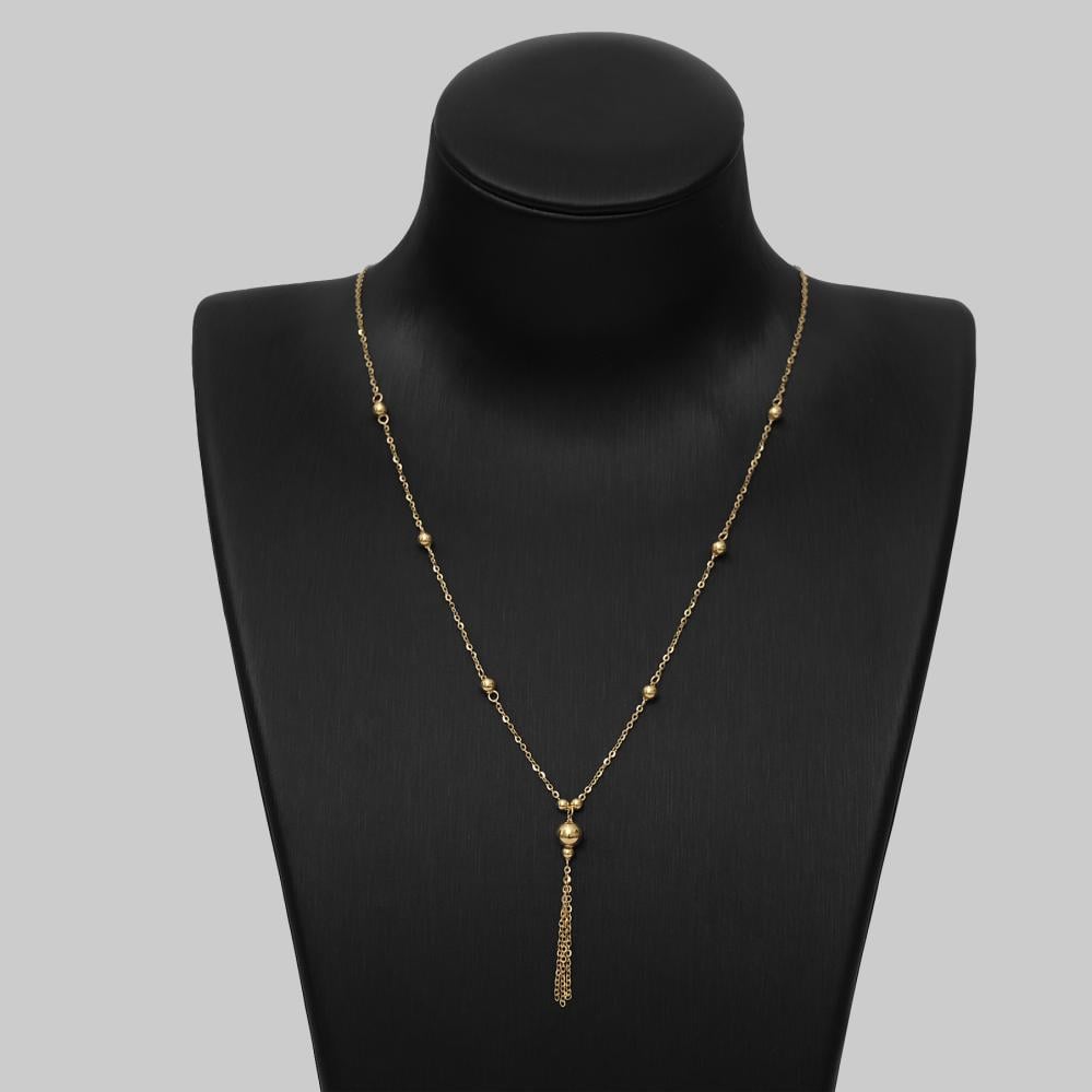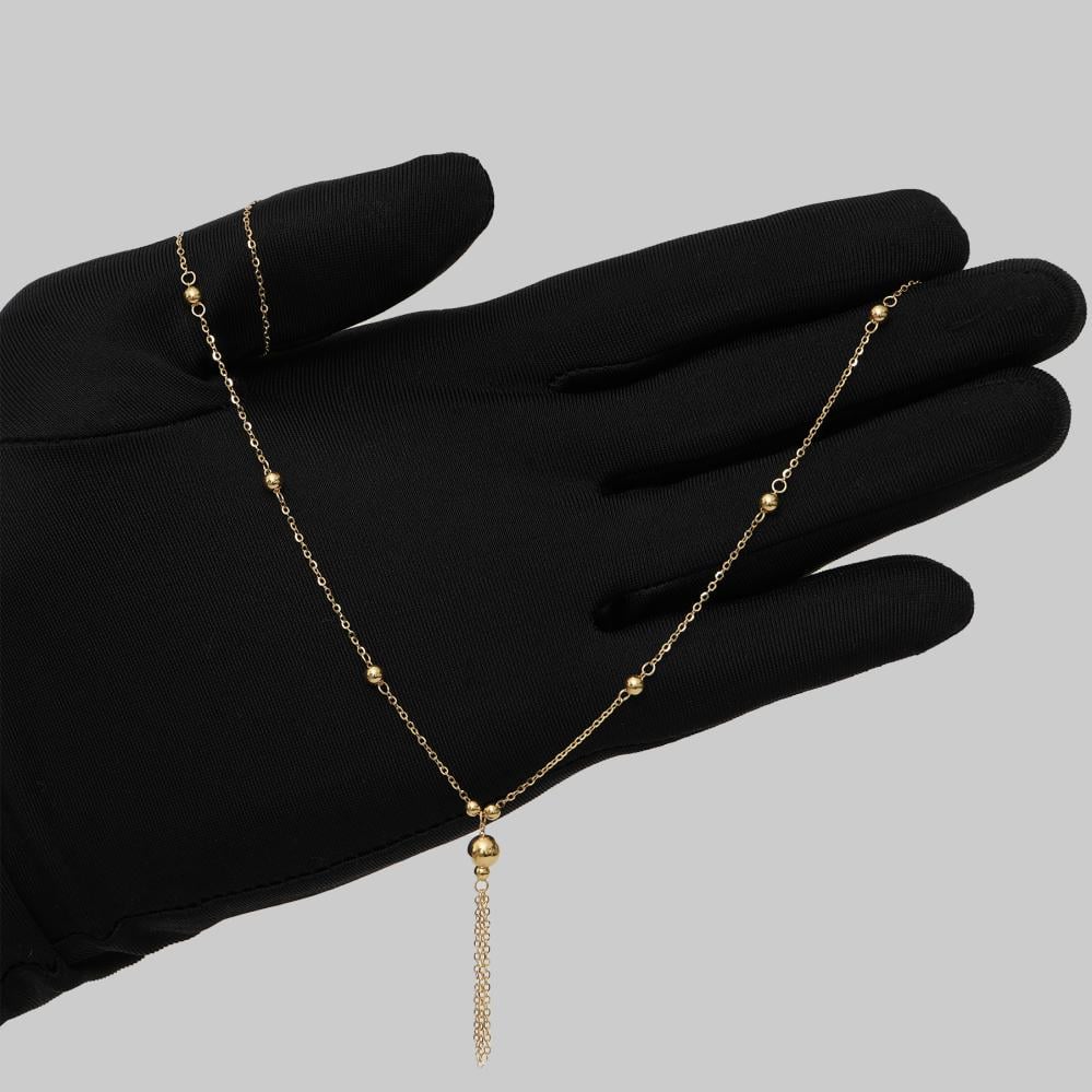 أضيفي إلى إطلالتك لمسة رقيقة من الجمال مع عقد لمسة الأنوثة المصنوع من ذهب عيار 21. تصميمه الناعم المتدلّي بكرات ذهبية صغيرة مع لمسات السلسلة الرقيقة يعكس بساطة مترفة وأناقة عصرية، ليكون خيارك المثالي لكل مناسبة.